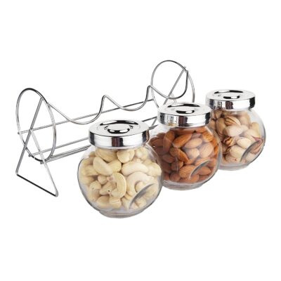3 pc transparent Glass Spice Jar Set And Dray Fruit Container with steel rack 300 ml each (set of 1)