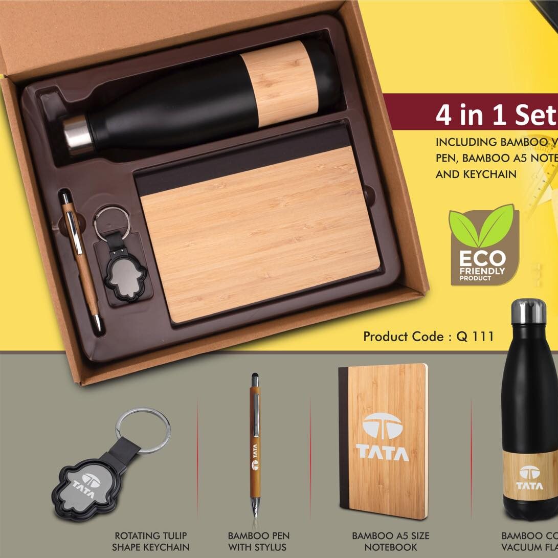 Home OFFICE UTILITIES ECOFRIENDLY GIFTS 4 in 1 Bamboo set: Keychain, Bamboo vacuum flask, Bamboo pen and A5 bamboo cover notebook in Kraft Gift Box