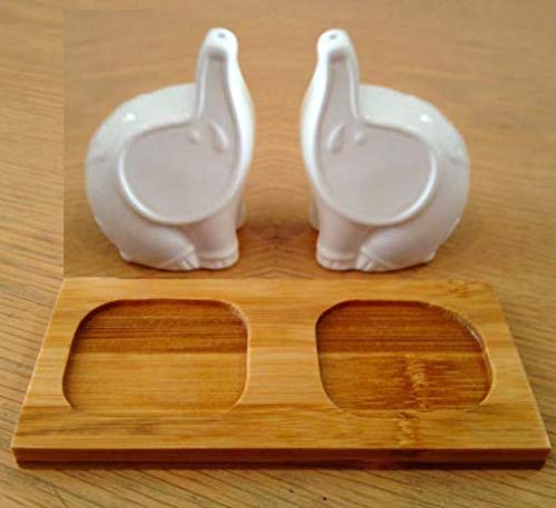 Home RETAIL SALE Elephant Shaped Salt N Pepper on Bamboo Wood Stand.