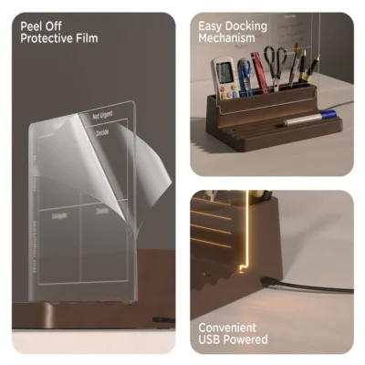 Taskmaster Lite embraces minimalism with the Eisenhower Matrix design. This compact LED desk organizer offers a reduced height acrylic sheet, providing simplicity without compromising on efficiency. Choose a minimalist design for your workspace without sacrificing functionality.
